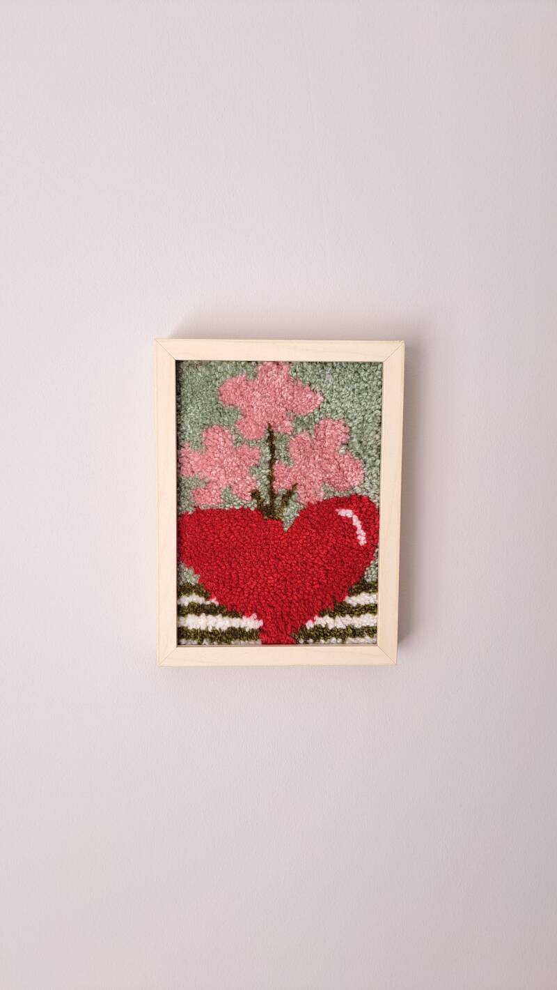 Een lieflijk werkje met een grote rode harten vaas. Met lichtgroene achtergrond en gestreept tafelkleed.